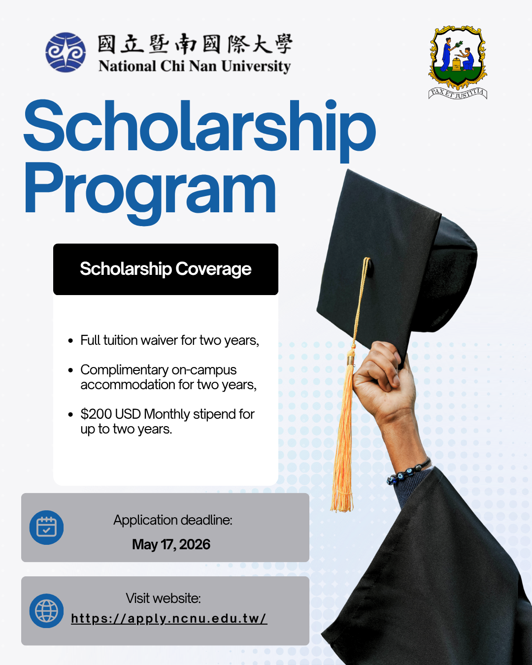The Ministry of Foreign Affairs, Foreign Trade, Foreign Investment and Diaspora Affairs kindly informs the general public that National Chi Nan University (NCNU) in Taiwan is offering Master’s degree scholarship opportunities to nationals of Saint Vincent and the Grenadines.